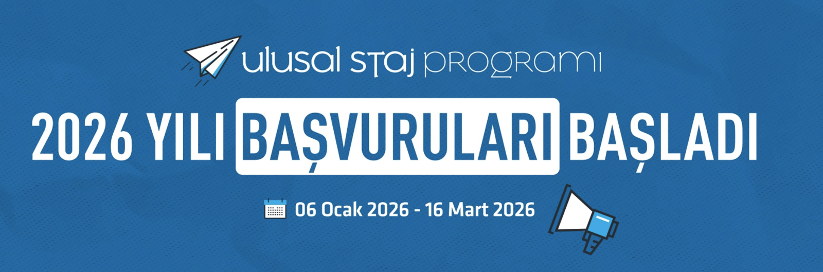 Türkiye Cumhuriyeti Cumhurbaşkanlığı 2026 Yılı Ulusal Staj Programı Başvuruları Başladı Detaylı bilgi için: https://ulusalstajprogrami.iskur.gov.tr/ Son Güncelleme : 09.01.2026 11:57 Okunma Sayısı : 14